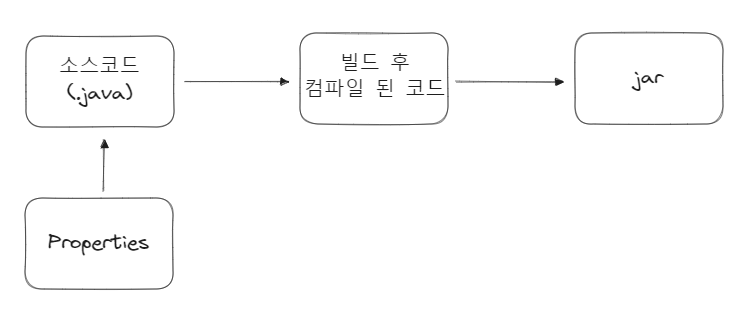 이를 해소하기 위해 외부에서 properties를 읽어 소스코드가 실행되거나 컴파일 될 때 값을 설정한다. 어떤 환경에서든 값을 외부에서 받아오니 소스코드의 변경 없이 환경에 의존하는 값을 다르게 사용할 수 있다. 소스코드의 변경을 최소화 하는 것은 중요하다!