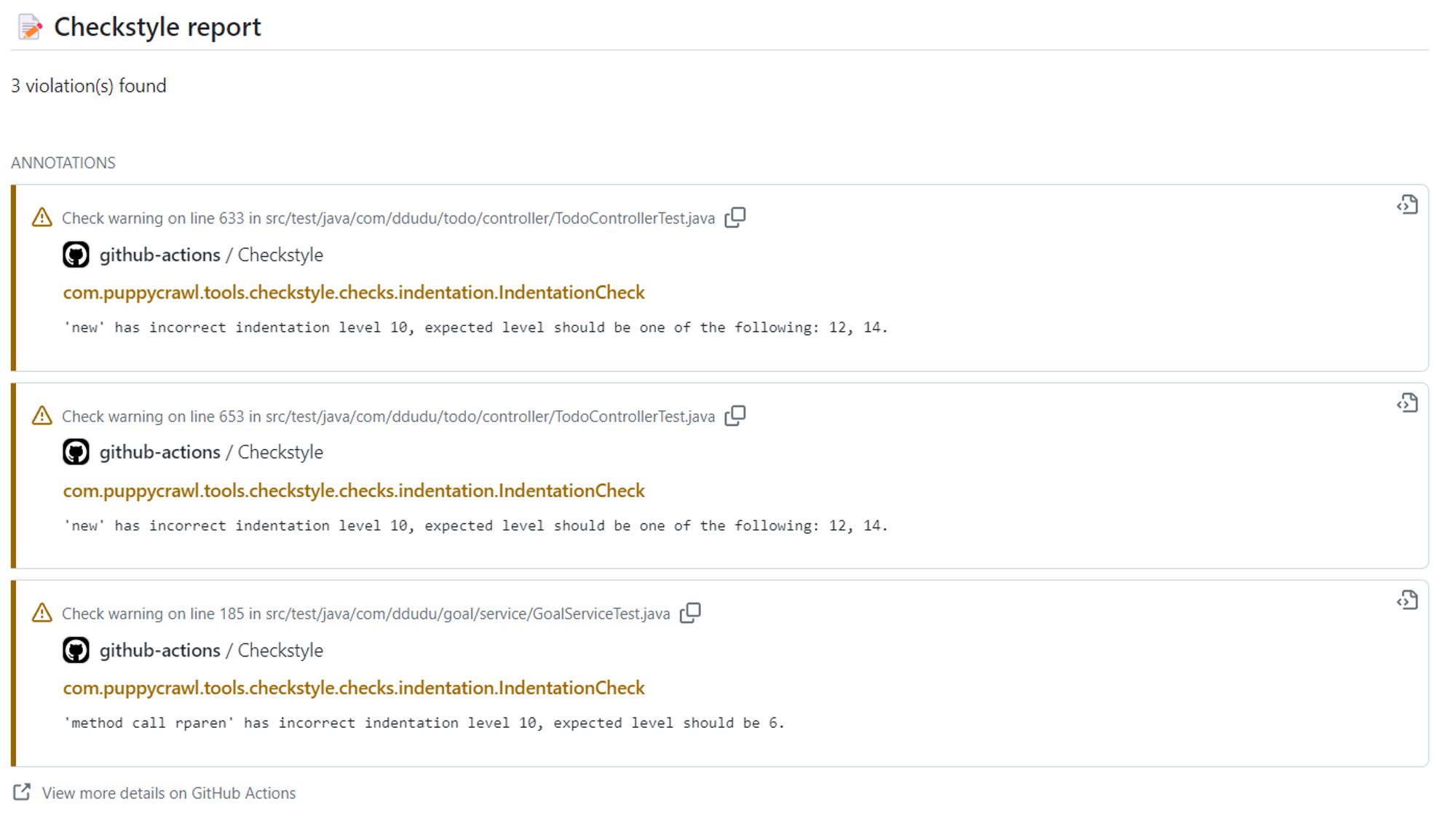비교적 최근에 나와 꾸준히 관리되고 있는 action이 있다. 이 action을 사용하면 좀 더 간단하게 GitHub Actions YAML만으로도 CI에 추가가 가능하니 활용하는 것도 좋다고 생각한다. 무엇보다 코멘트로 작성해주는 것이 어찌보면 번잡해보일 수도 있지만 눈에 잘 들어오니 괜찮은 것 같다. 이건 나중에 적용해봐야겠다. 이걸 적용했다고 해서 Gradle에 build에서 checkstyle plugin을 무작정 빼면 안된다! 인텔리제이 플러그인으로 돌리거나 Gradle build을 통해 원격 레퍼지터리에 올리기 전에 확인은 꼭 필요하다.