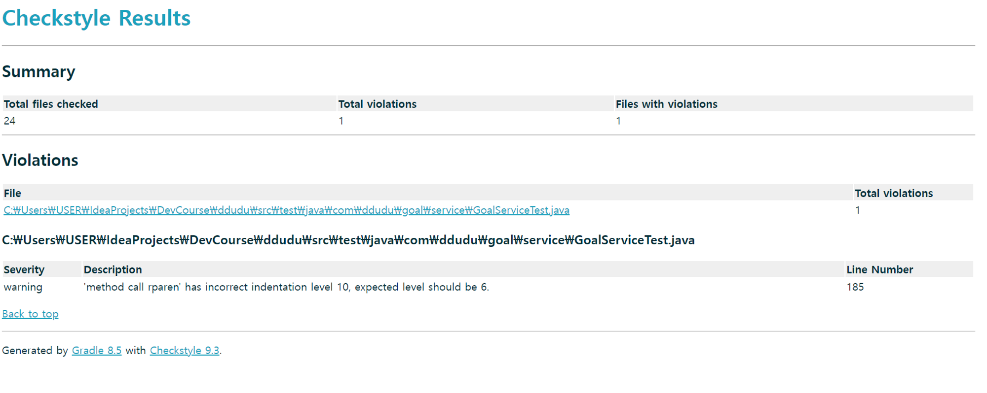 그리고 빌드를 하면 checkstyle 리포트가 생성된다. 리포트가 생성되는 위치는 다음과 같다.