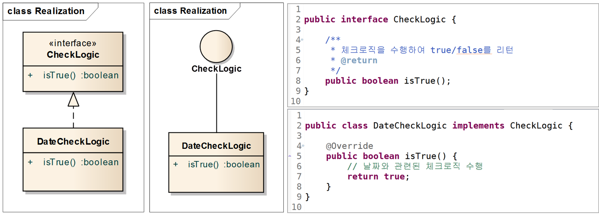 구현은 점선에 빈 화살표로 나타낼 수 있다. UML에선 이를 실체화(Realization)이라고 한다. 하위 객체가 상위 객체를 구현함으로써 추상적인 상위 객체의 실체를 만들어주기 때문이다.