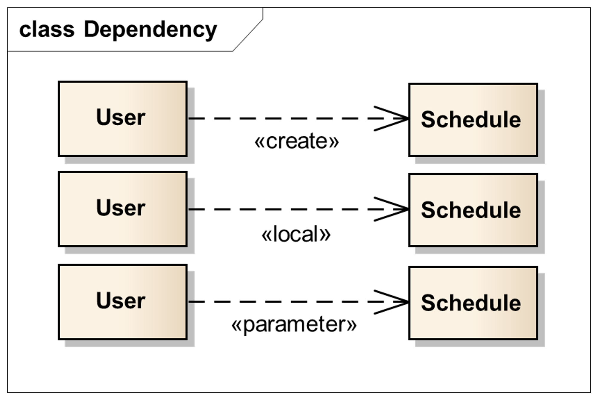 위에서도 언급했듯이, 의존 관계는 추상화를 표현할 수도 있고, 소유를 표현할 수도 있으며, 사용을 표현할 수도 있다.