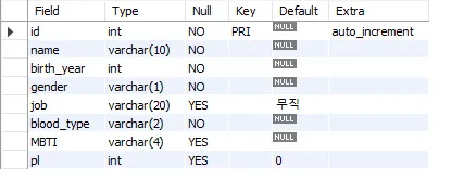 | id | name | birth_year | gender | job | blood_type | MBTI | pl | id | name | description |
