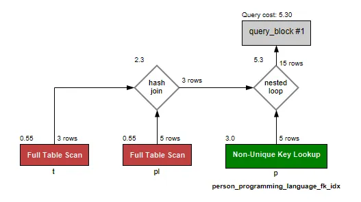 이번엔 person 테이블에서 인덱스가 걸린 속성으로 테이블을 스캔해 비용이 감소된 것을 확인할 수 있다. 하지만 programming_language를 Join할 때 여전히 Full Table Scan을 실행한다. NL Join 방식은 위에서 언급했던 것처럼 선별된 키를 가지고 후행테이블을 스캔하기 때문에 후행테이블의 인덱스 유무에 크게 영향받지 않는다. 다만, 테이블들의 인덱스와 크기에 따라 위와 같이 선행테이블을 조정할 수 있으며 예상되는 실행 계획을 변경해 비용을 줄일 수 있다.
