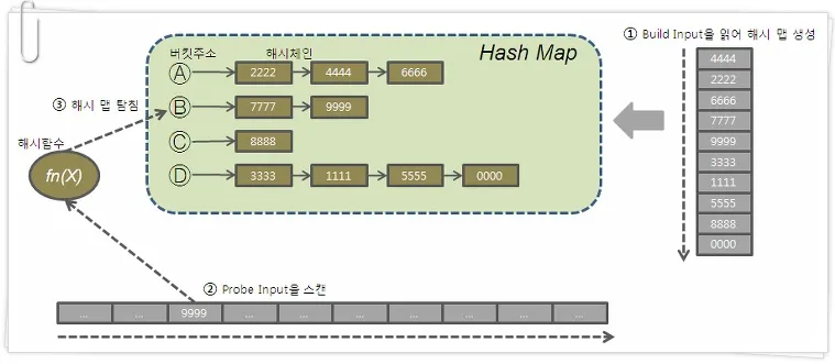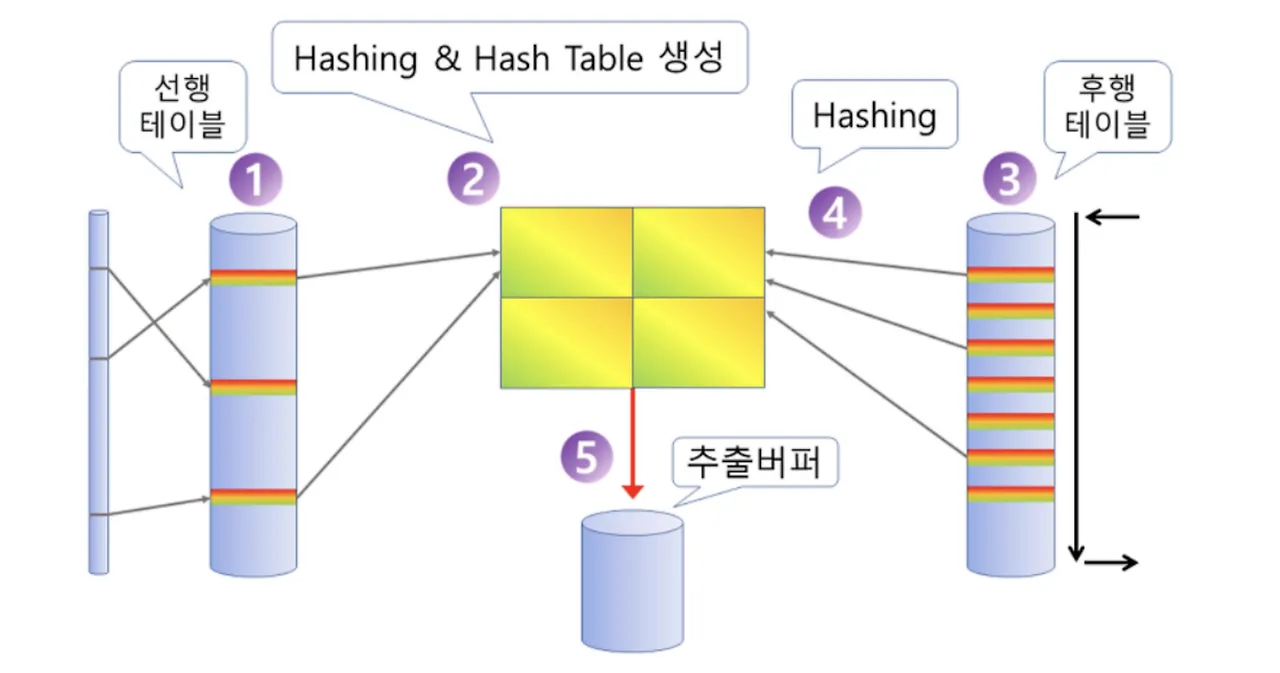 - 상대적으로 큰 테이블을 스캔해 각 값의 해시값이 존재하는지 확인