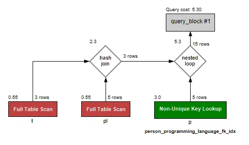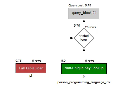 보다시피 인덱스가 걸려있는 programming_language 테이블을 선행테이블 삼아 Nested Loop 방식을 실행하는 것을 확인할 수 있다.