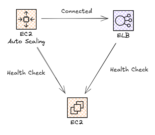 일반적으로 ASG는 ELB와 연결되어 사용된다. 하지만 기본적으론 ASG는 ELB의 Health Check를 사용하지 않는다. ASG에 등록된 EC2 인스턴스는 연결된 ELB에도 등록되며, ASG가 Health Check를 수행하기 위해선 EC2 인스턴스로부터 직접 상태를 확인한다.