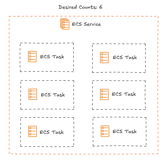 예를 들어, `desiredCount`가 6인 ECS 서비스가 태스크 인스턴스를 유지 관리하고 있다고 가정해보자.