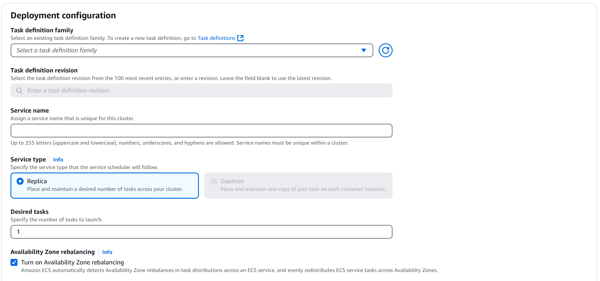 서비스 스케쥴러가 실행시킬 태스크의 정의를 선택해야하고, Fargate 시작 유형은 기본적으로 서비스 유형이 `Replica`이다. `Daemon`유형은 클러스터에 등록된 인스턴스에 모두 태스크가 실행되는 것이지만 `Replica`유형은 클러스터에 등록된 인스턴스 수와 상관없이 원하는 수만큼의 태스크만이 여러 가용영역에 밸런스 있게 배포되는 것이다. `Replica`는 실제 서비스와 관계있는 유형이고, 그러한 인터넷 서비스 유형이 고려대상이 아닐 때 `Daemon`유형을 고려하면 된다. 예를 들면, 로그 수집이나 모니터링 등에 대한 시스템 레벨 에이전트가 필요할 때다.