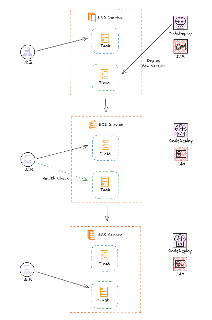 블루/그린 배포 방식을 지원하기 위해선 ECS 서비스가 ELB에 연결되어 있어야한다. 블루/그린 환경은 ELB가 가리키는 타겟 그룹이 된다. ECS 서비스 태스크에 대한 권한이 있는 IAM 역할을 가진 CodeDeploy 서비스에서 그린 타겟 그룹에 배포를 성공하면 ELB가 그린 타겟 그룹으로 라우팅하며 블루/그린 배포가 진행된다.