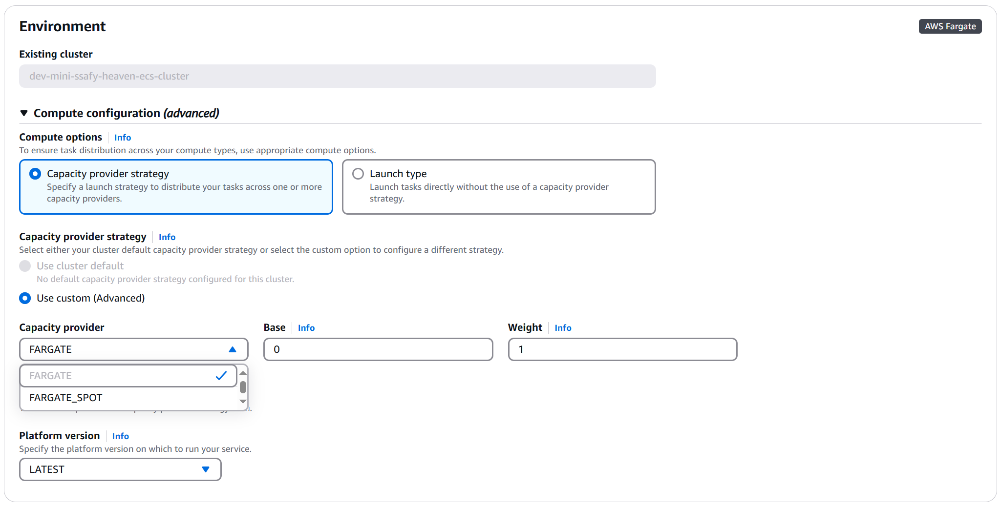 인프라 용량을 조절하는 클러스터에는 Capacity Provider를 통해 서비스나 태스크에 용량을 공급한다. Fargate 유형은 기본적으로 `FARGATE`와 `FARGATE_SPOT`이 등록된다.