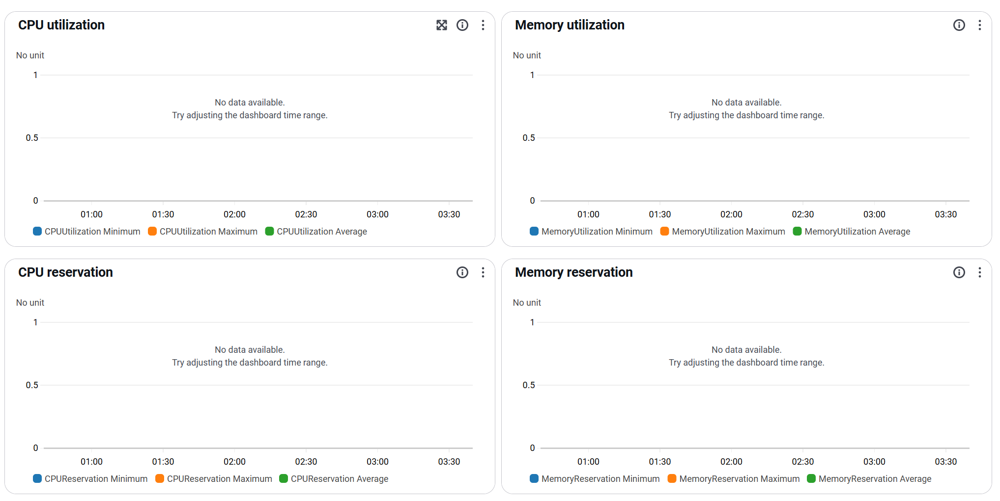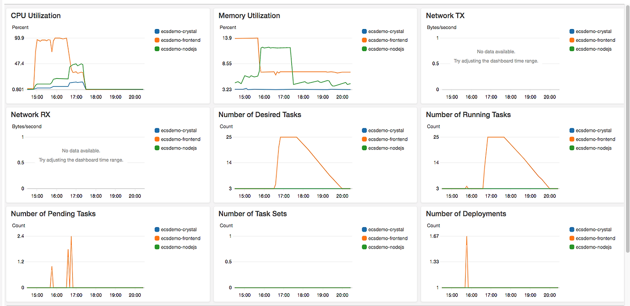 모니터링 기본 유형을 선택하면 서비스 단위의 기본적인 CPU 사용량이나 메모리 등에 대한 지표와 태스크 단위의 네트워크RxTx 등에 대한 지표를 확인할 수 있다.