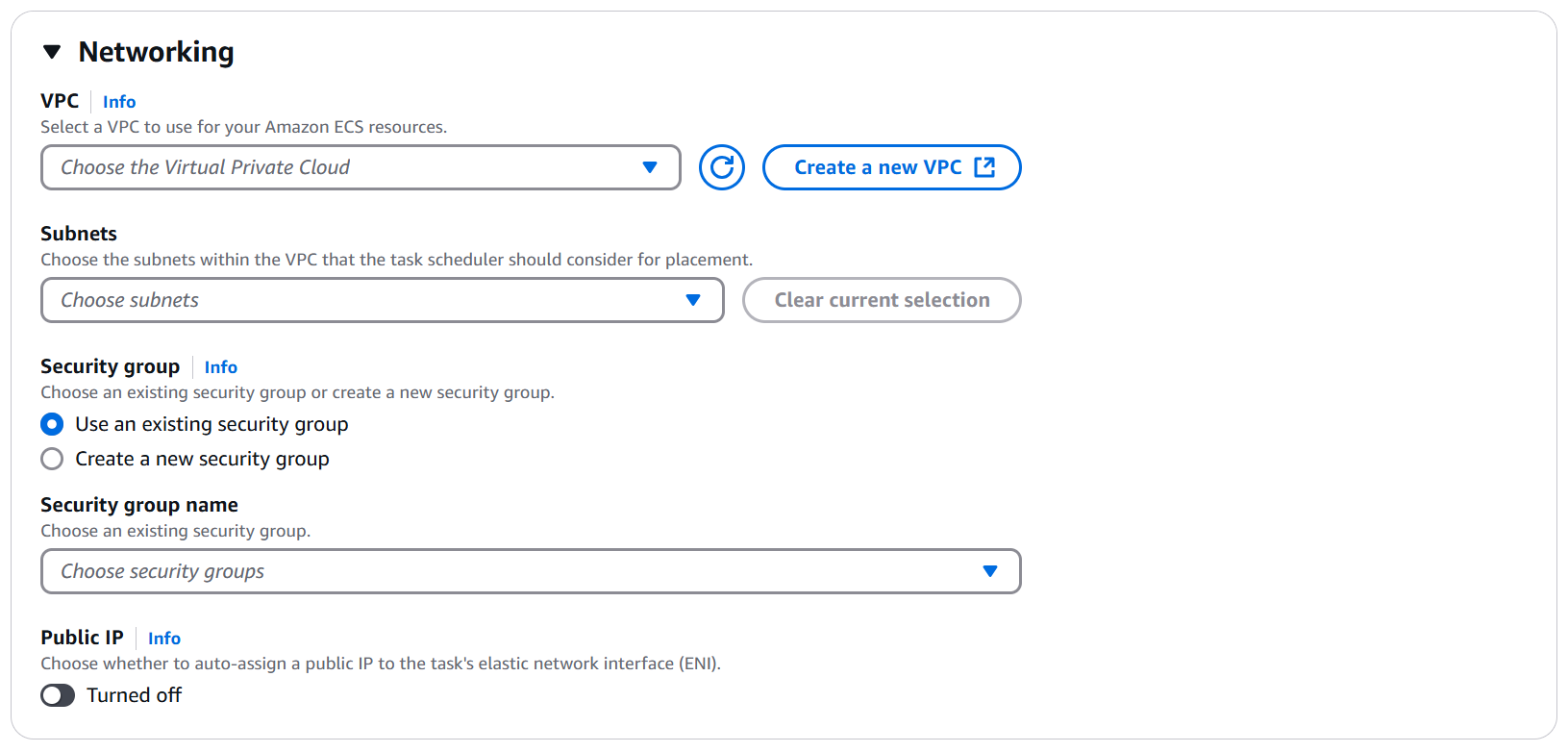 가장 아래의 Public IP는 컨테이너 네트워크 형식이 `awsvpc`일 경우에만 가능하다. `awsvpc`일 경우 컨테이너 네트워크 내의 컨테이너 인스턴스는 모두 ENI(Elastic Network Interface)를 할당받게 된다. 그럼 해당 ENI에 public IP를 할당하는 것이 가능하기 때문에 해당 옵션을 활성화 할 수 있다. 하지만, 기본 도커 네트워크인 `bridge`나 `host`를 태스크의 네트워크 모드로 설정한다면, 외부의 네트워크가 아닌 컨테이너 런타임 내부의 네트워크이기 때문에 컨테이너는 호스트의 NAT에 따르게 된다. 그렇기 때문에 해당 옵션이 켜져있더라도, 활성화되지 못한다.