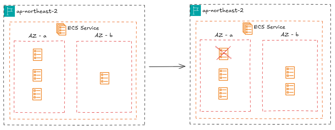 리밸런싱이 시작되면 태스크가 가장 적은 AZ에서 태스크를 실행하고, 태스크가 가장 많은 AZ에서 태스크를 종료하는, 아주 단순한 리밸런싱이다.