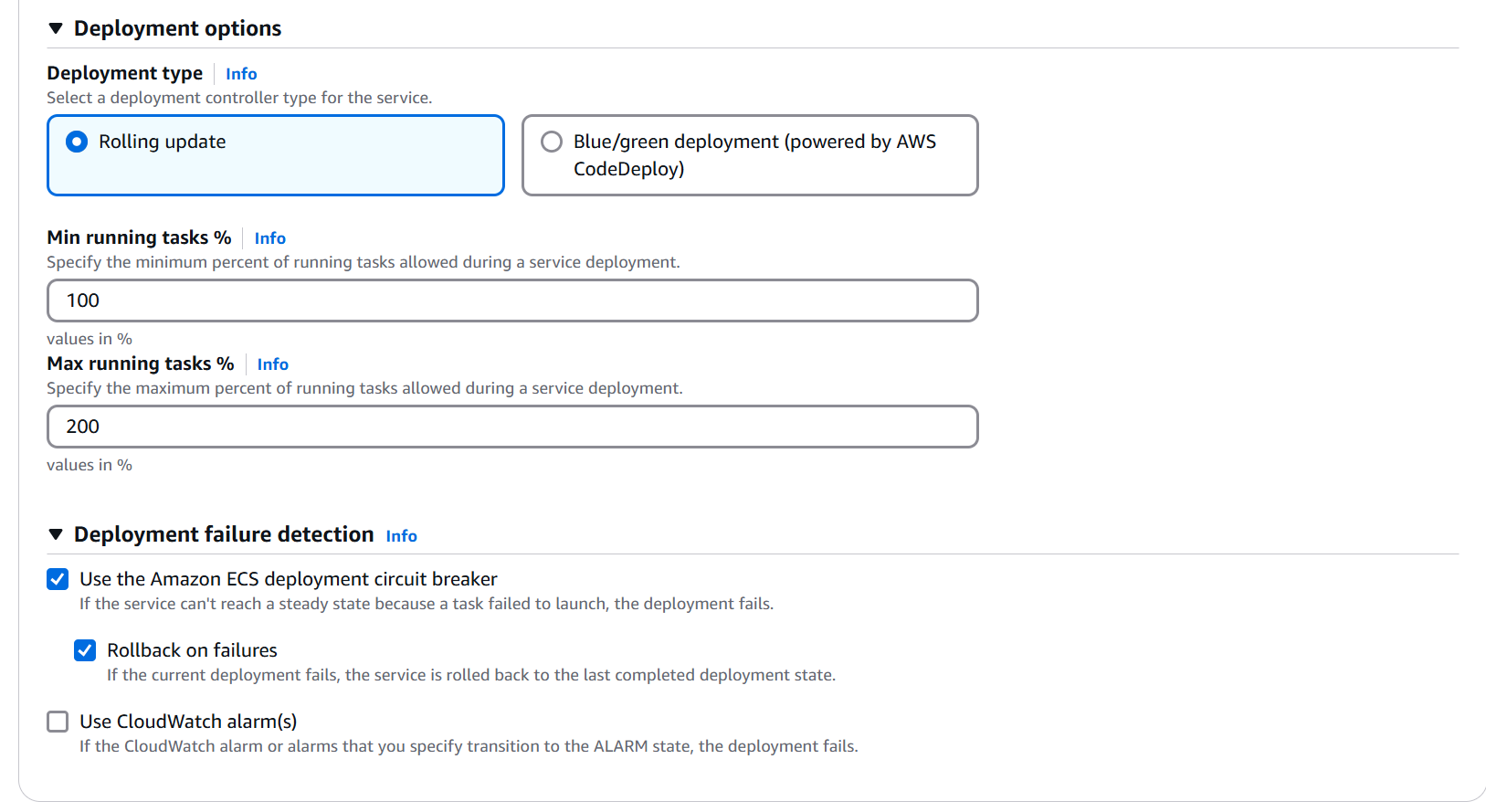이와 같이 `minimumHealthyPercent`와 `maximumPercent` 수치를 관리해서 롤링 방식의 배포 속도와 가용성을 조절이 가능하고, 만약 배포에 실패할 시 이전 버전으로 롤백하는 옵션도 활성화 할 수 있다.