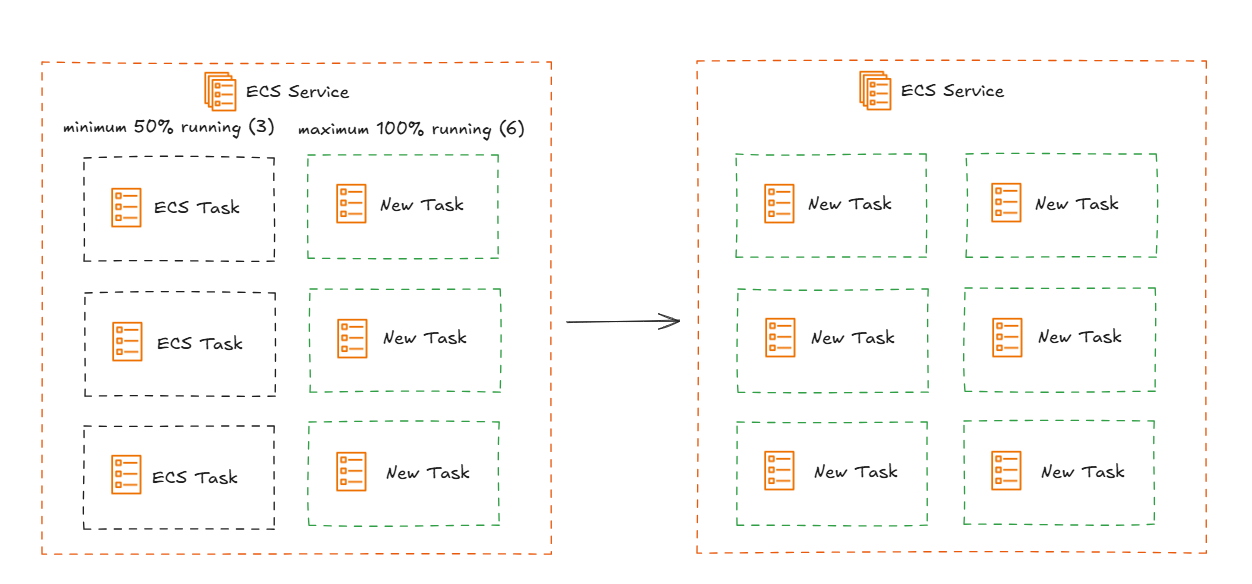 만약 `minimumHealthyPercent`가 50%로 6개 중 3개의 태스크만 정상적으로 동작해야하고, `maximumPercent`가 100%로 최대 6개의 태스크만 동작시킬 수 있다면, 우선적으로 3개의 태스크를 종료시키고 3개의 새로운 태스크를 실행해서 부분 업데이트를 수행한다.