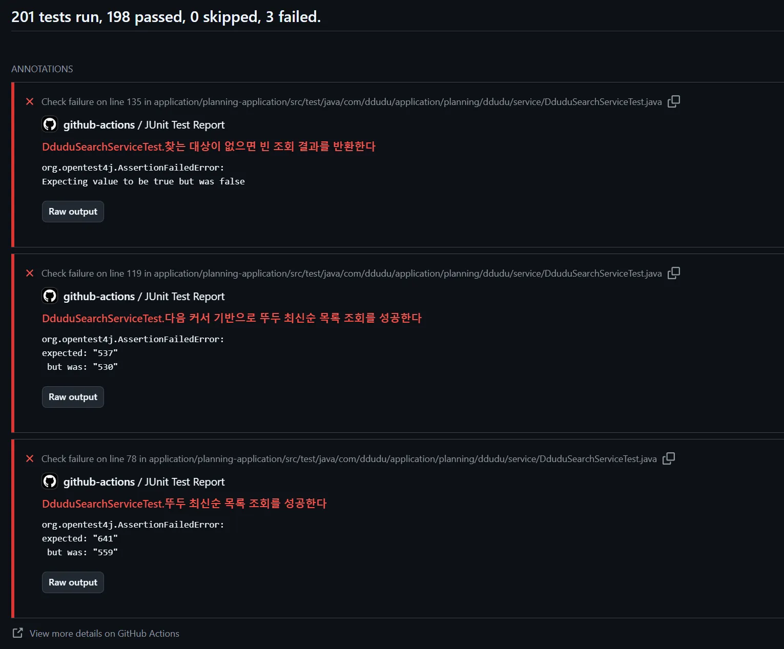 어떤 이유던 테스트에 실패할 때가 있다. 실패한 테스트를 찾기 위해 GitHub Actions 페이지의 로그를 살펴보아야 한다.
