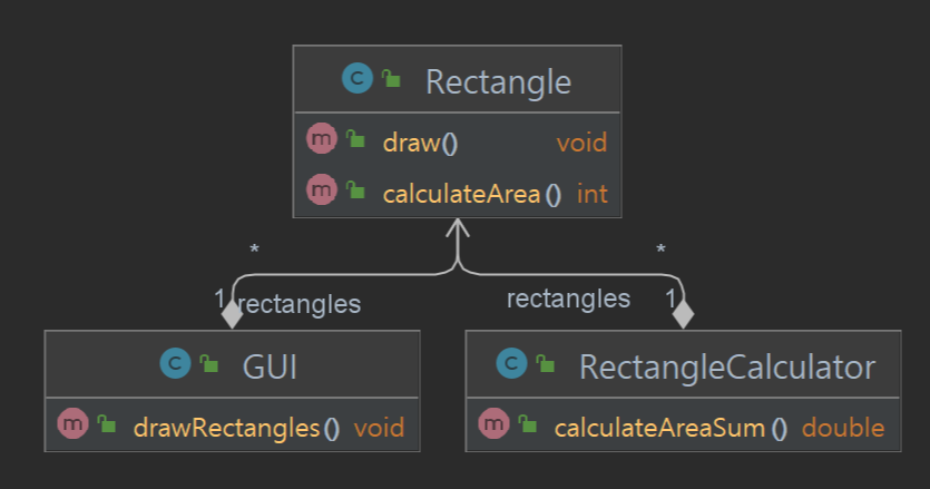 두 객체는 각각 다른 책임을 지니고 있다. RectangleCalculator는 여러 직사각형들의 계산을 책임지고, GUI는 여러 직사각형들을 그리는 책임을 가지고 있다. 직사각형들의 다른 계산을 추가하고 싶다면 RectangleCalculator로 가서 추가하고, 직사각형들의 그래픽에 수정이나 추가를 하고싶다면 GUI로 가서 수정하면 된다. 나름 직관적인 것처럼 보인다!
