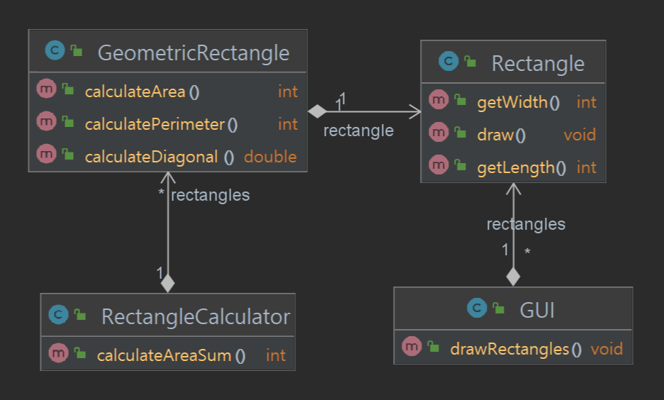 RectangleCalculator: 직사각형들의 넓이의 합을 구하는calculateSum()이라는 함수를 가지는 객체GUI: 직사각형들을 그리는 객체