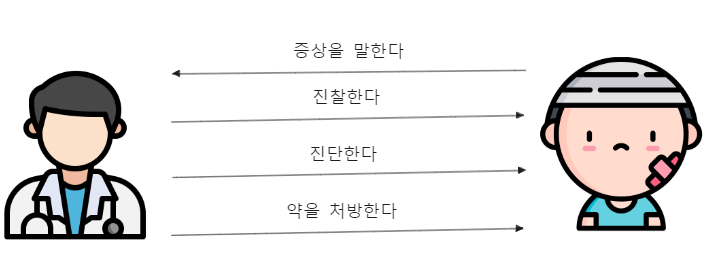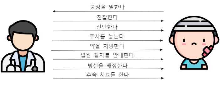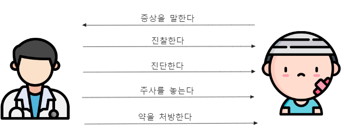 이전 상황과 같이 환자가 아픈 곳이 있어 의사를 찾아온 상황을 가정해보자. 하지만 이번엔 단순히 진단을 받고 약을 처방받는 것만으로는 부족하고, 주사를 맞아야한다.