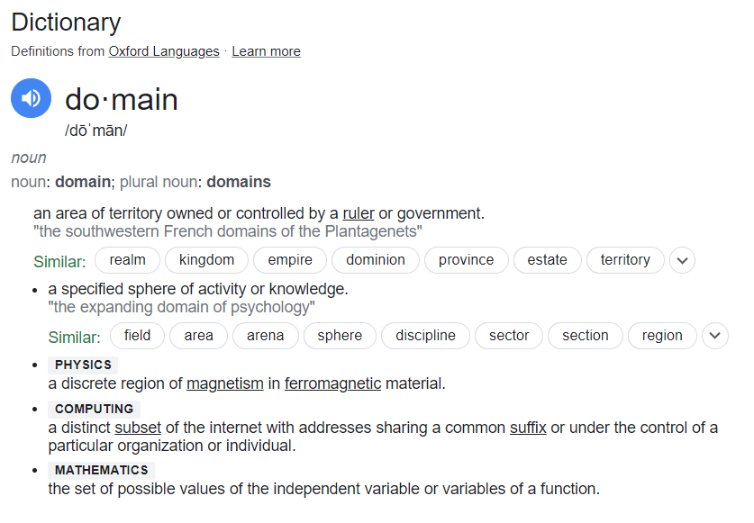 구글에 간단하게 도메인에 대한 사전적 정의를 찾아봤다. "area of territory", "specified sphere", "dicrete region", "distinct subset" 등등 주로 특정한 구역 혹은 범위를 나타낸다.
